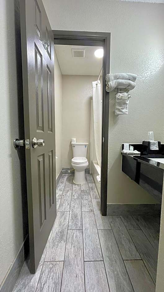 A seating area with a TV, a desk and a private bathroom are featured in this family room. The unit offers 2 beds.